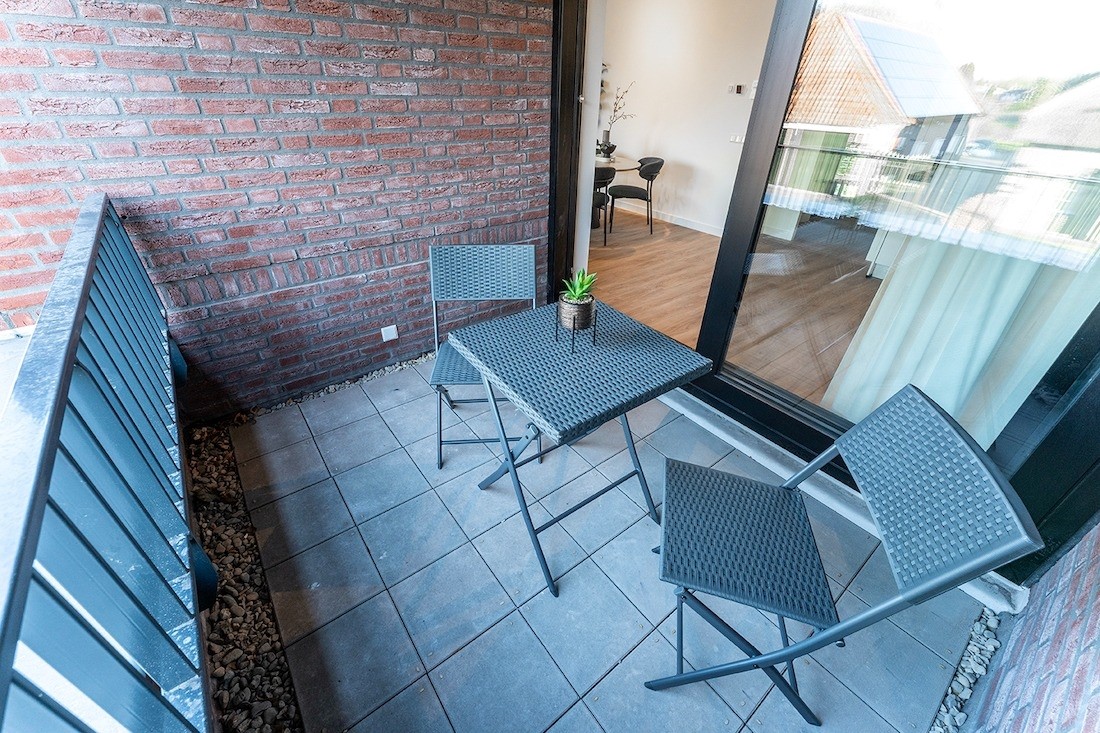 The living room features a minimalist design, with a comfortable seating area that includes a luxury couch and a flat-screen TV. Adjacent to the living room is a dining area that overlooks a stylish, fully equipped kitchen, which contains a dishwasher, oven, and microwave. There is also a separate toilet for guests, and you can enjoy the beautiful weather on your own balcony.