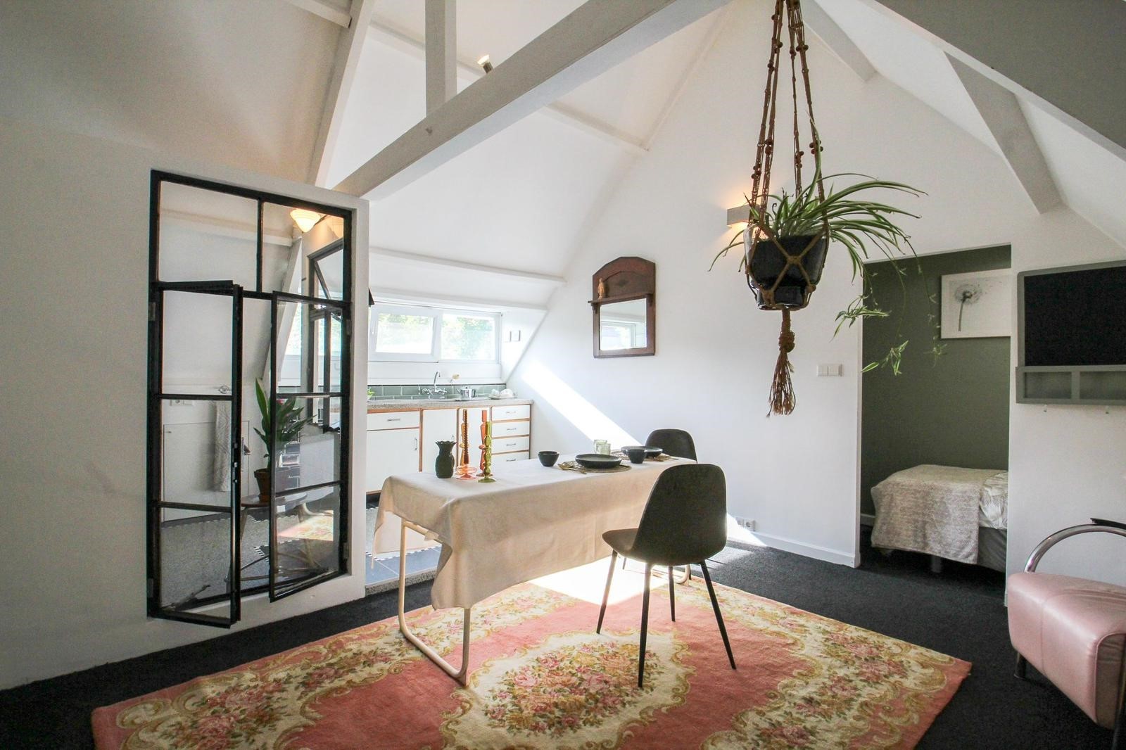 The studio is situated in a quiet 1930s neighborhood, De Armhoefse Akker, which is a popular area in Tilburg. It’s just a three-minute bike ride to the city center, the O13 pop center, bars, museums, the harbor, nature park, restaurants, and shopping center. Tilburg University is also nearby. Parking in the neighborhood is free.