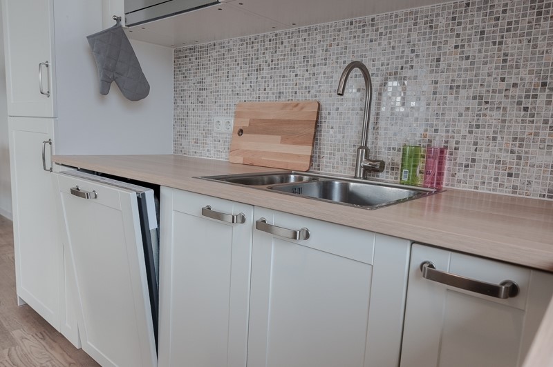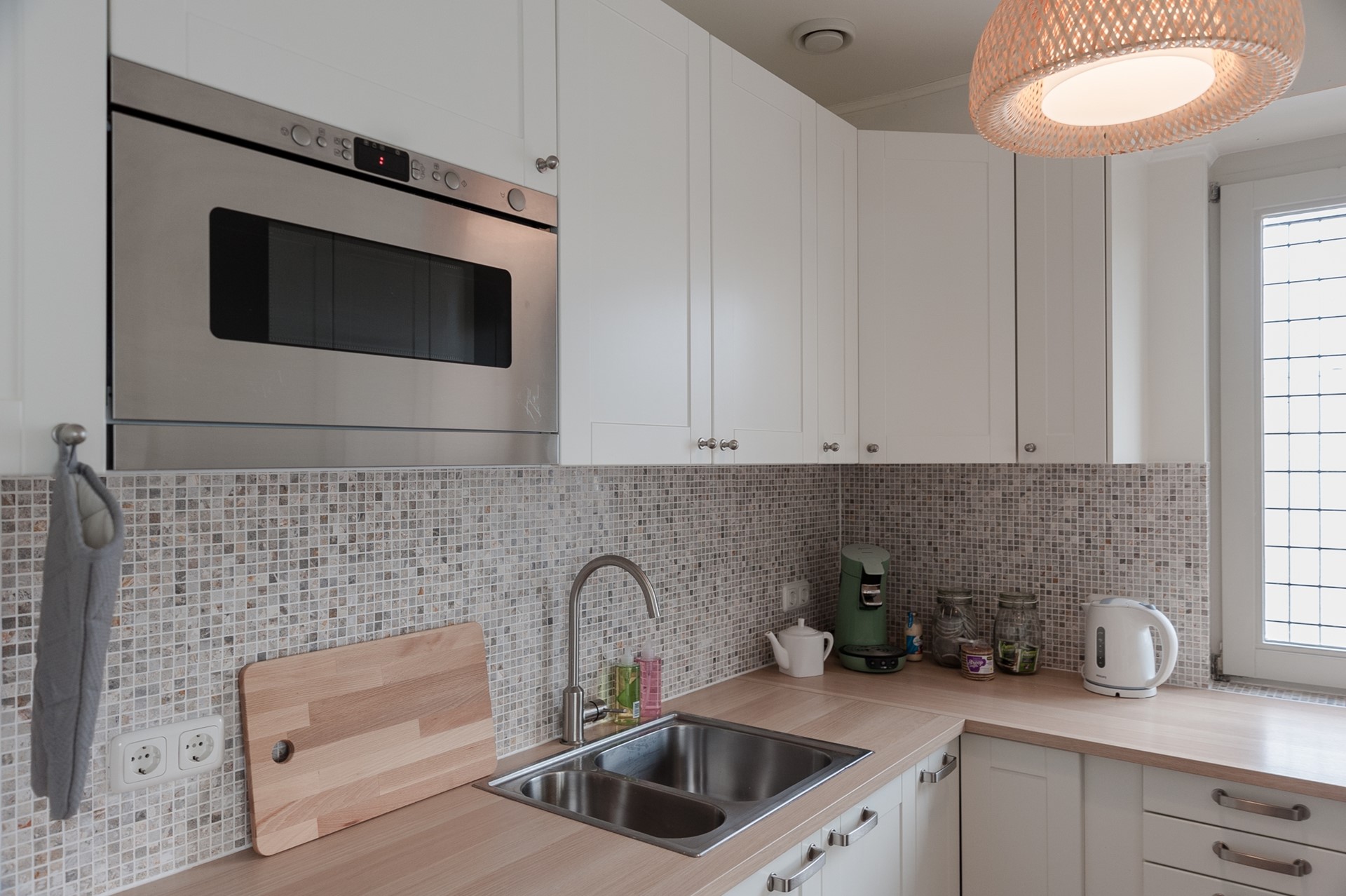 The well-equipped kitchen contains a dishwasher, oven, four-burner stove, and microwave. The terrace, accessible from the living area, provides comfort even in winter as it features windows that can be fully opened or closed.