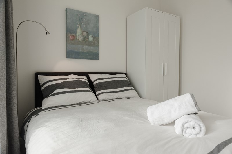 The main bedroom includes a king-size double bed and a large wardrobe for your belongings. The second bedroom offers a double bed and a closet for your clothes.