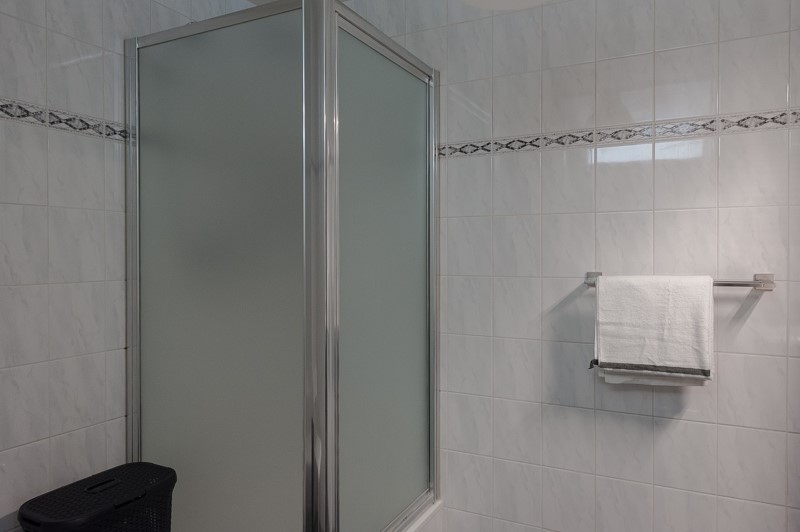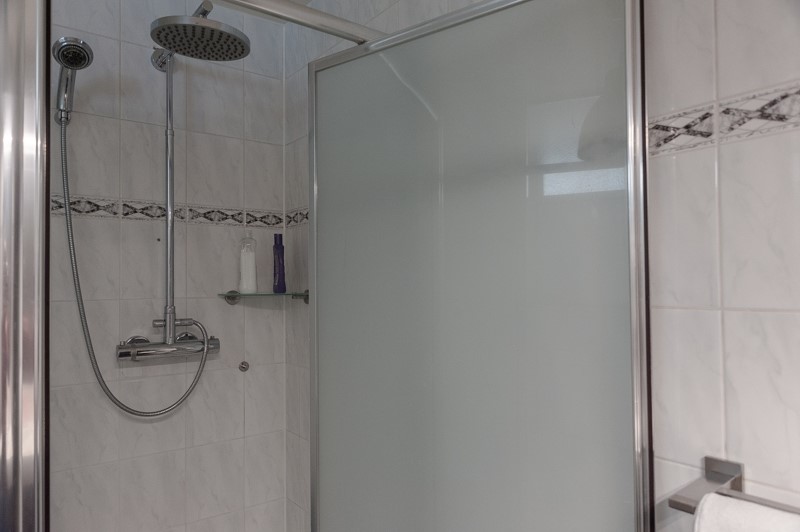 The bathroom and toilet are separate. The spacious bathroom has a rain shower and plenty of storage space.