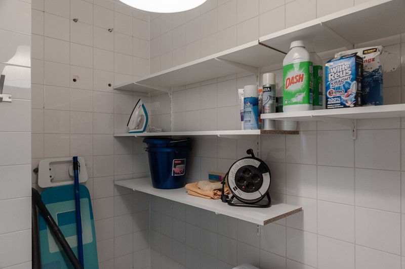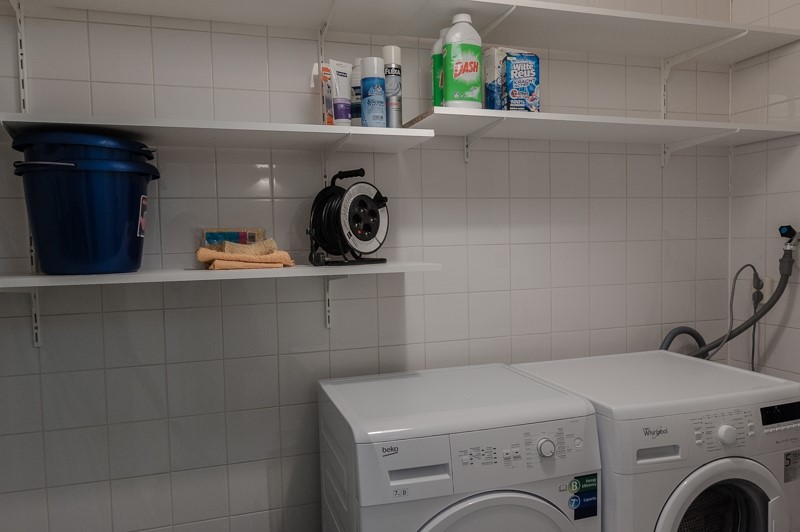 A separate storage room and another storage area on the ground floor house a washing machine and dryer.