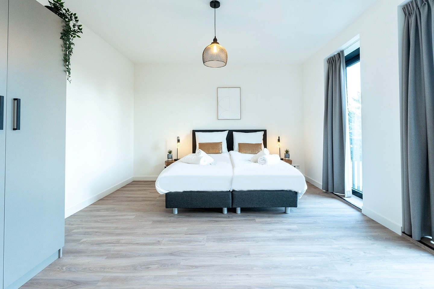 Wood-look flooring, blackout curtains, fully furnished including linen and kitchenware.