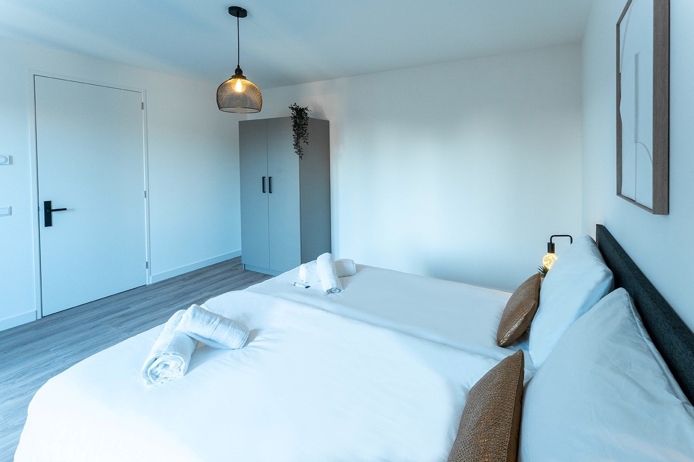 The bedrooms are furnished with a bed and bedding, and include a wardrobe for clothing. The modern bathroom features a walk-in shower, vanity unit, and a luxurious look thanks to the use of natural tones.